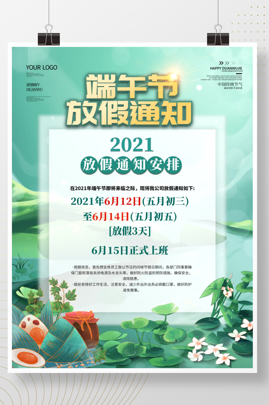 值端午节来临之际,根据国务院办公厅公布的《2021年节假日安排的通知》的有关规定,结合我公司实际情况,经领导班子研究决定,现将2021年端午节放假事项通知如下: